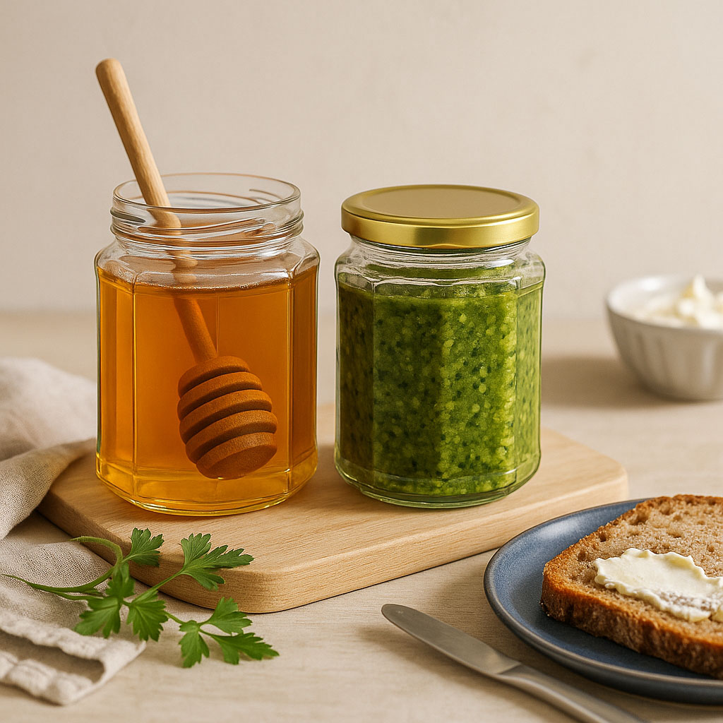 De elegante flerkantholdere kombinerer æstetisk design med praktisk funktionalitet. Deres tolvkantede bund giver dem et særligt udseende og sikrer samtidig pladsbesparende opbevaring. Fremstillet i Europa, imponerer de med deres høje kvalitet og alsidighed. Uanset om det er til aromatiske pastaer, krydrede pestoer, frugtige marmelader eller fin honning – disse glas tilbyder den perfekte emballage til forskellige specialiteter.