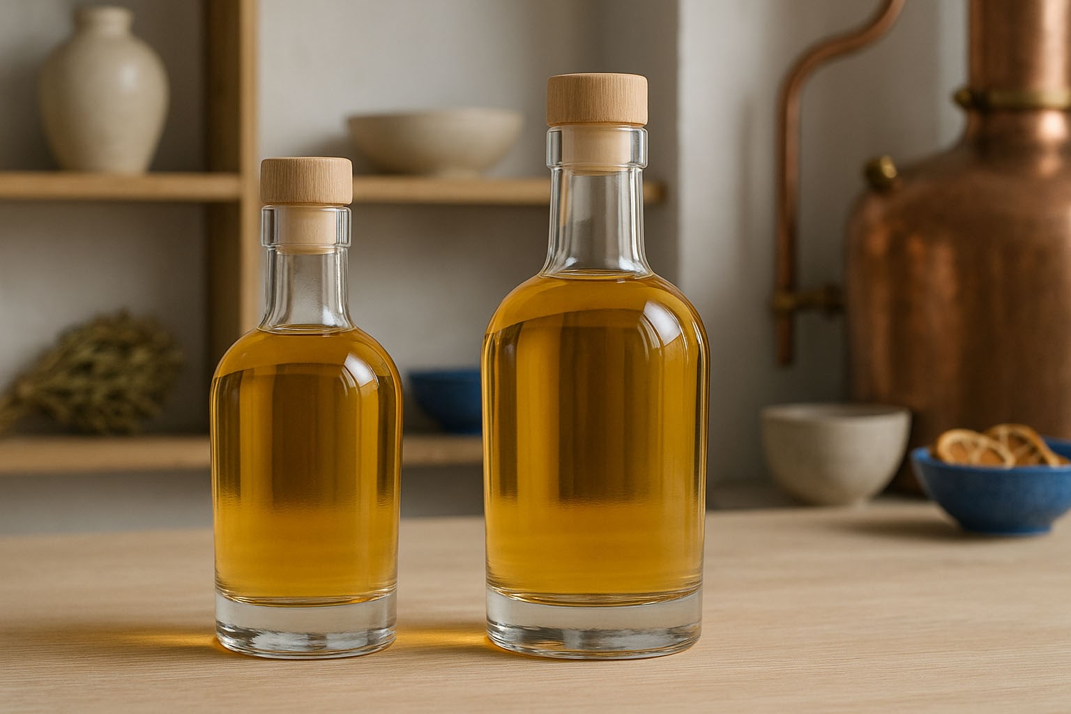 Den ædle designflaske „Amarillo“ forener italiensk håndværk med tidløs æstetik. Dens karakteristiske træk er den markante glasbund, som sikrer et eksklusivt udseende og en behagelig fornemmelse. Den harmonisk formede silhuet fremhæver karakteren af de udsøgte indhold og gør den til det ideelle valg for krævende tappere. Takket være båndmundingen og de højkvalitets korkpropper – som fås i vores sortiment – bevares aromaen perfekt.