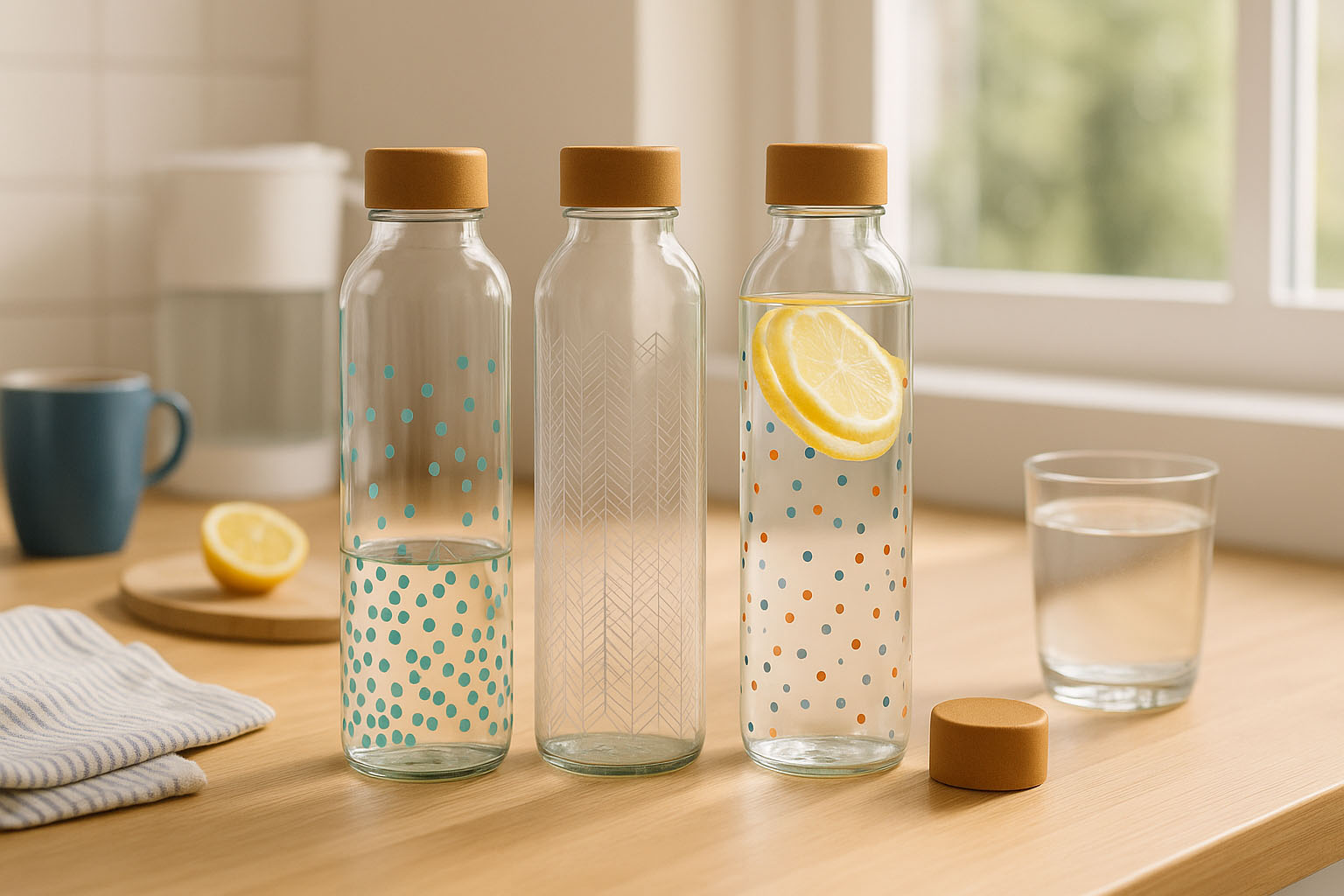 CARRY Bottle kombinerer moderne design med bæredygtighed og funktionalitet. Den er den ideelle drikkeflaske for miljøbevidste mennesker. Fremstillet af højkvalitetsglas overbeviser den med sin holdbare kvalitet og den slanke, cylindriske form, som ligger behageligt i hånden. Den praktiske skruemunding sikrer en tæt forsegling – passende låg fås i vores sortiment. Med kreative motiver som farverige prikker, flydende vandlinjer og geometriske strukturer sætter CARRY Bottle stilfulde accenter og gør drikkepausen på farten til et ægte statement. Perfekt til alle, der ønsker at forene æstetik og bæredygtighed i deres hverdag.