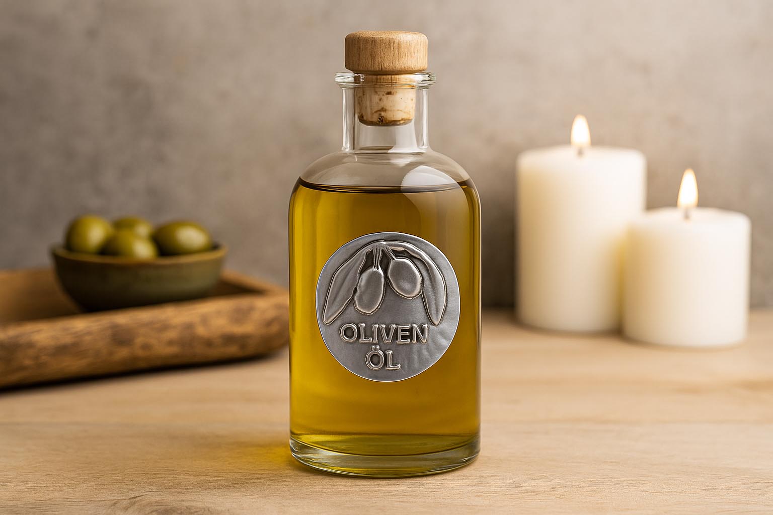 Flaskelandet Tinlabel 'Olivenolie', metal, sølv